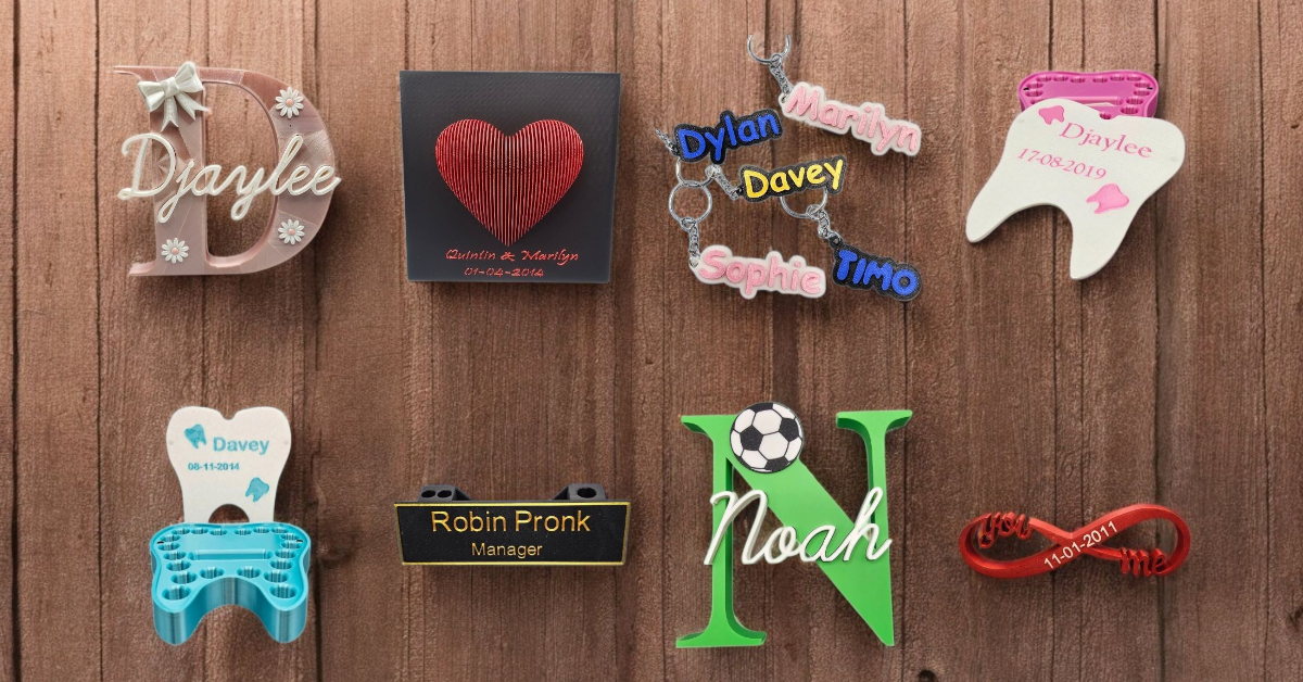 Bij Layerzz maken we verschillende gepersonaliseerde 3D-geprinte items die speciaal voor iemand worden ontworpen of aangepast. Zo ontstaat een product dat niet alleen mooi is, maar ook een persoonlijk verhaal vertelt.