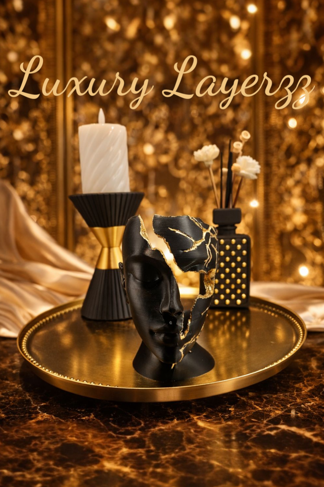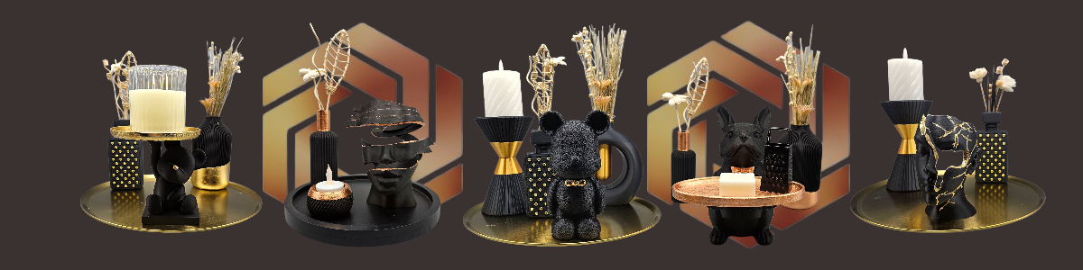 Een collectie luxe 3D-geprinte woonaccessoires waarin diep zwart wordt gecombineerd met goud en roségoud, voor een krachtige, elegante uitstraling.