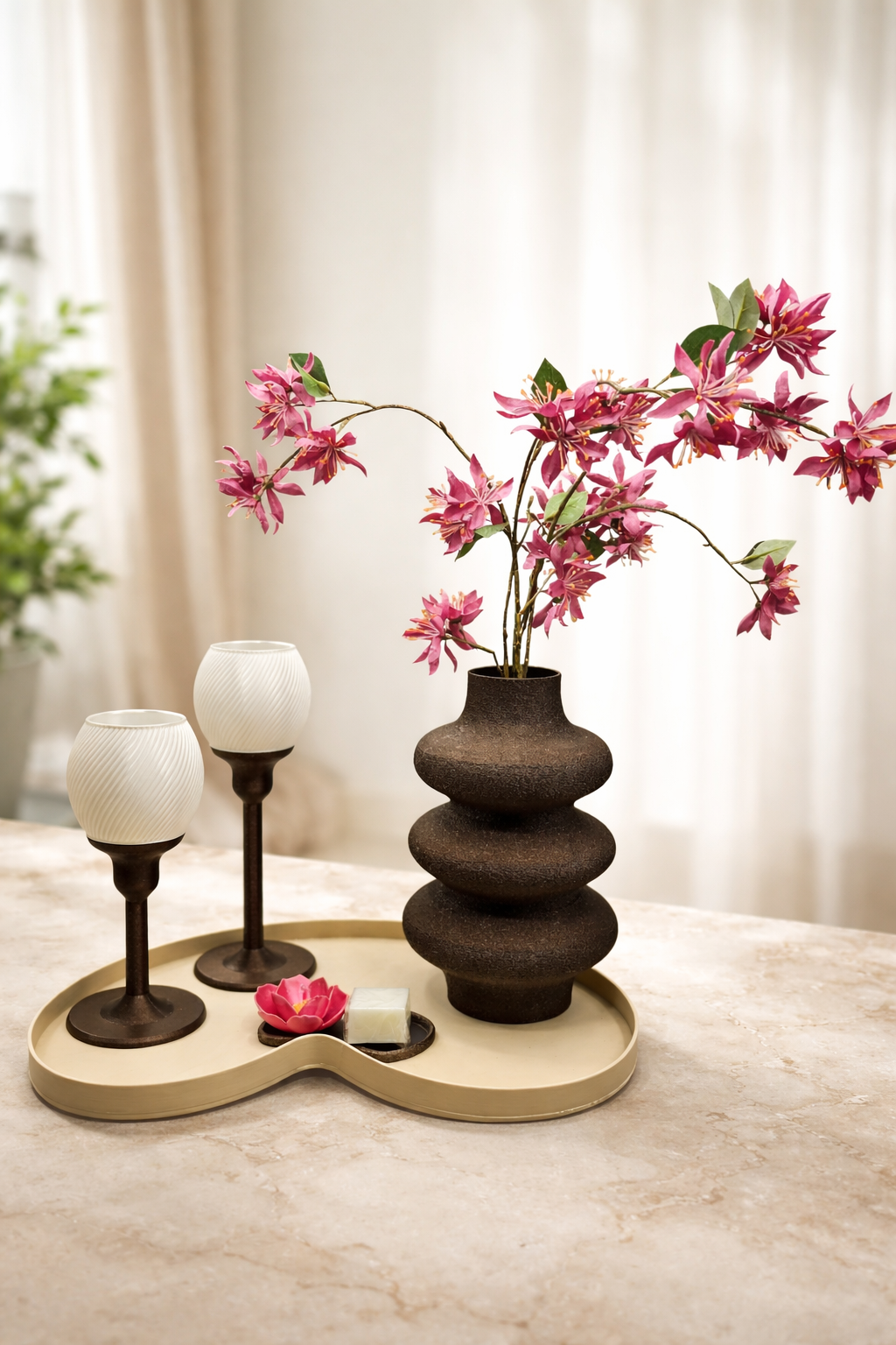 Het organische dienblad vormt de basis van deze set en laat alle decoratieve elementen mooi samenkomen. De Japandi style vaas in Galaxy bruin trekt direct de aandacht en is gevuld met sierlijke roze bloemtakken die het geheel een frisse en elegante uitstraling geven.