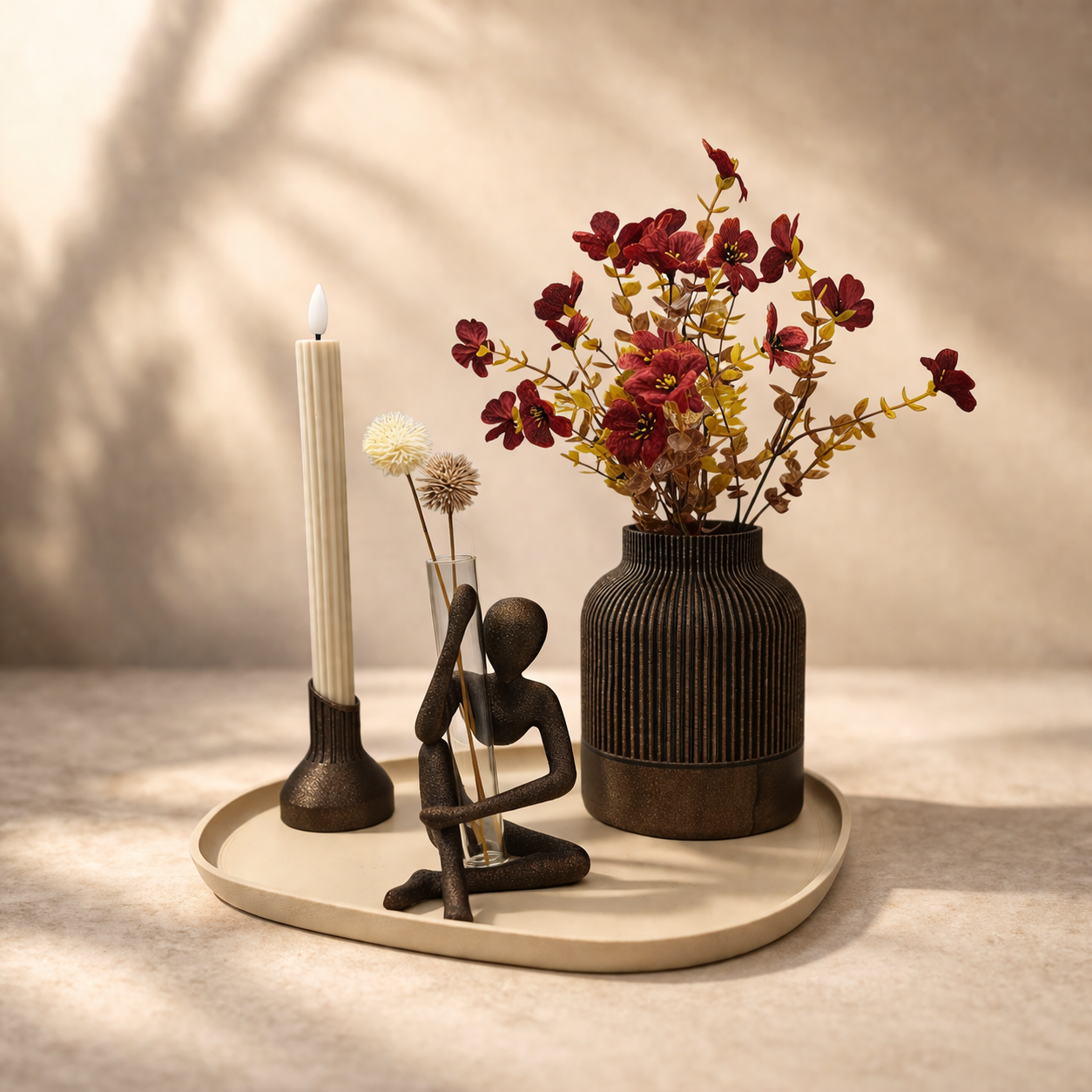Het organische dienblad vormt de basis van deze complete set en laat de verschillende decoratieve elementen mooi samenkomen. De elegante vaas is gevuld met sierlijke bloemen die direct kleur en leven toevoegen aan het geheel. De kandelaar met dinerkaars zorgt voor extra hoogte en een warme, sfeervolle uitstraling.